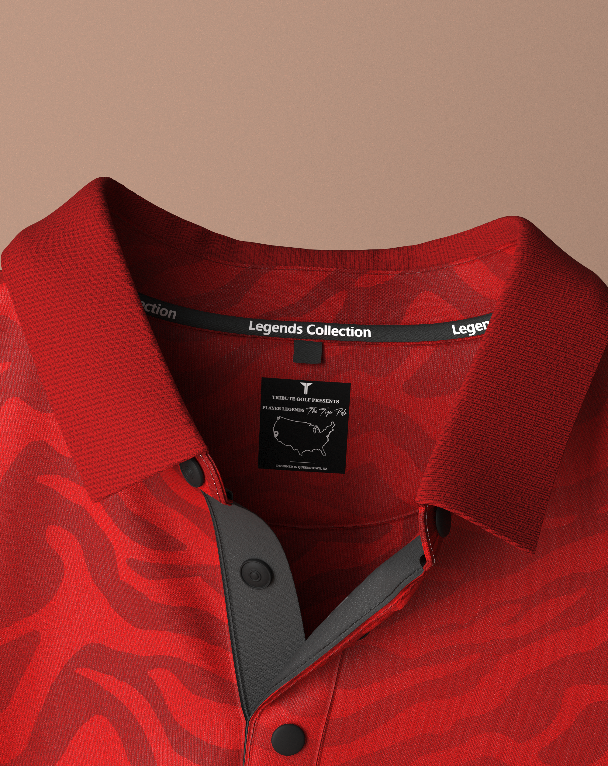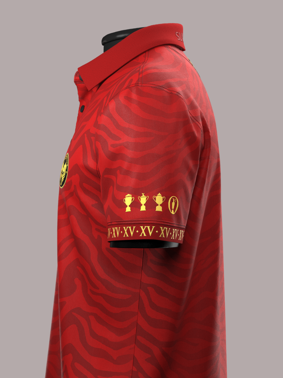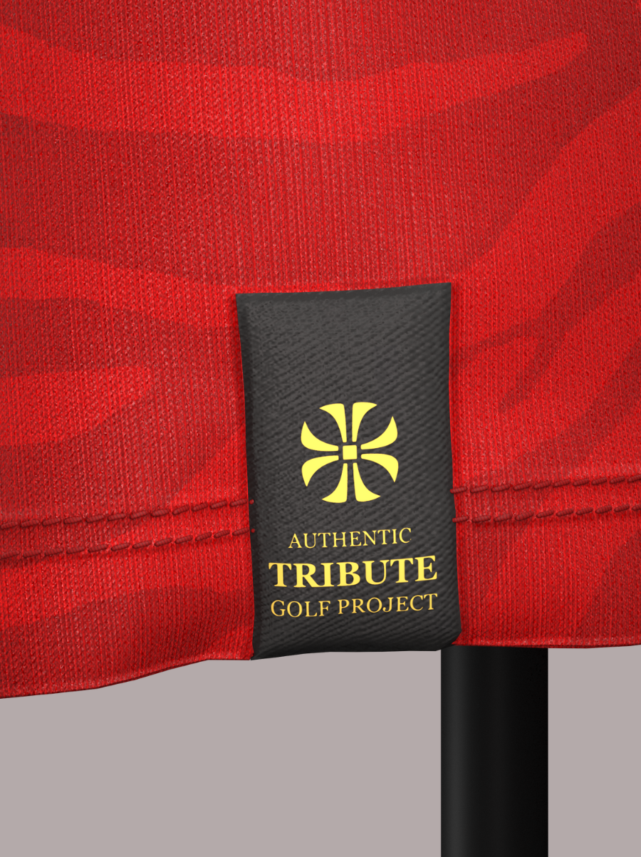 ‘Tribute Golf Club’ badge stands proud across the chest in gold and black. Confident and timeless. Beneath it, a tonal tiger-stripe jacquard flows through the premium performance fabric, a subtle nod to the mindset that made him unstoppable.