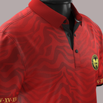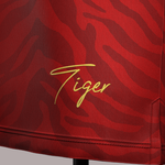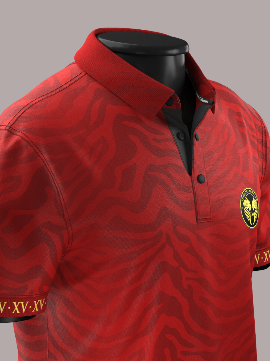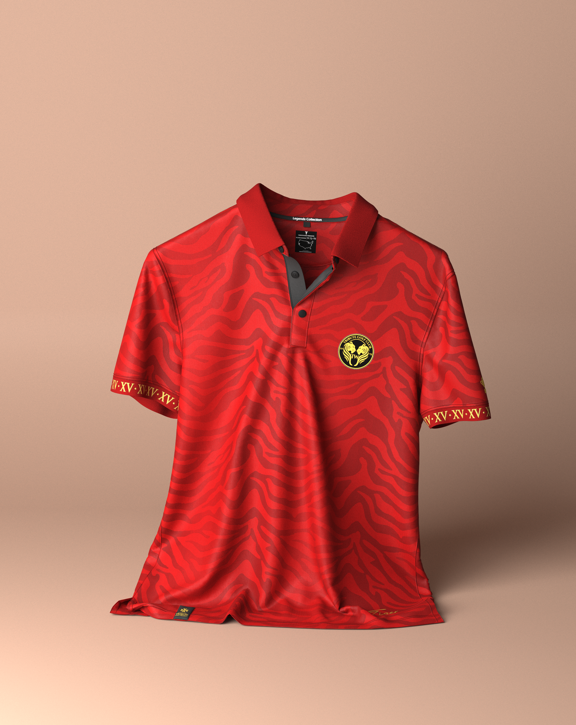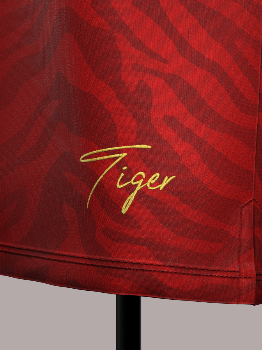 ‘Tribute Golf Club’ badge stands proud across the chest in gold and black. Confident and timeless. Beneath it, a tonal tiger-stripe jacquard flows through the premium performance fabric, a subtle nod to the mindset that made him unstoppable.